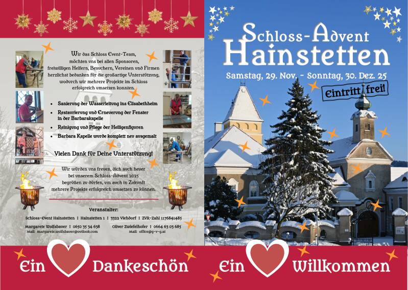 Der Reinerlös dieser Veranstaltung dient zur Erhaltung des Schlosses Hainstetten mit der Barbara Kapelle.